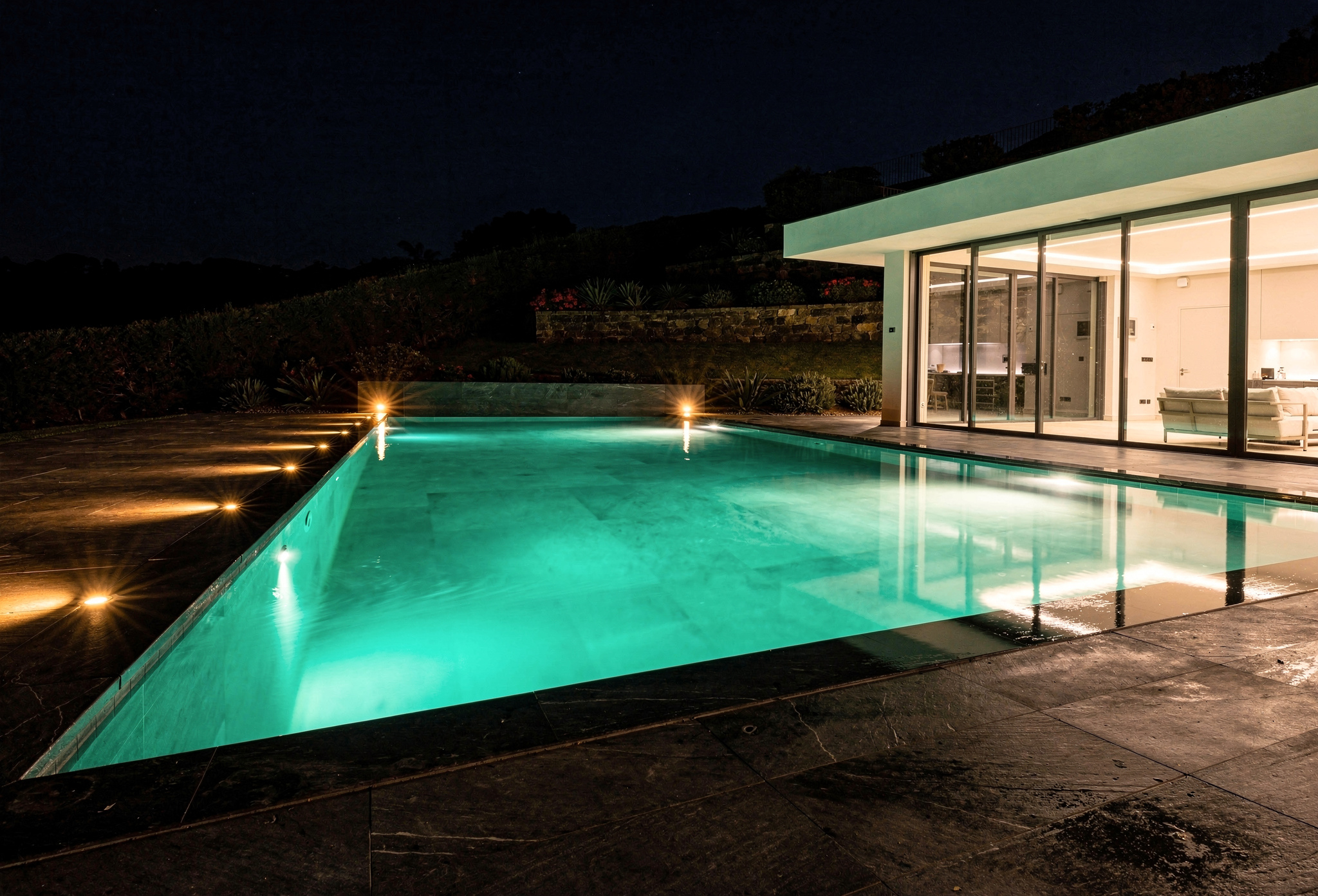 Boğaz manzaralı özel villaya entegre edilmiş sonsuzluk havuzu. İtalyan mozaik kaplama ve akıllı LED aydınlatma sistemi.